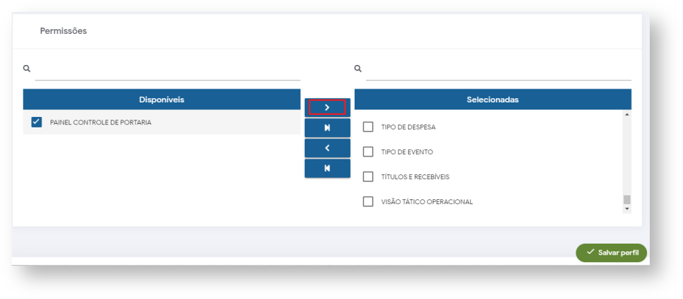 Selecionar a opção Painel Controle de Portaria nas permissões, Clicar no botão para mandar a opção para a caixa de permissões selecionadas conforme print abaixo