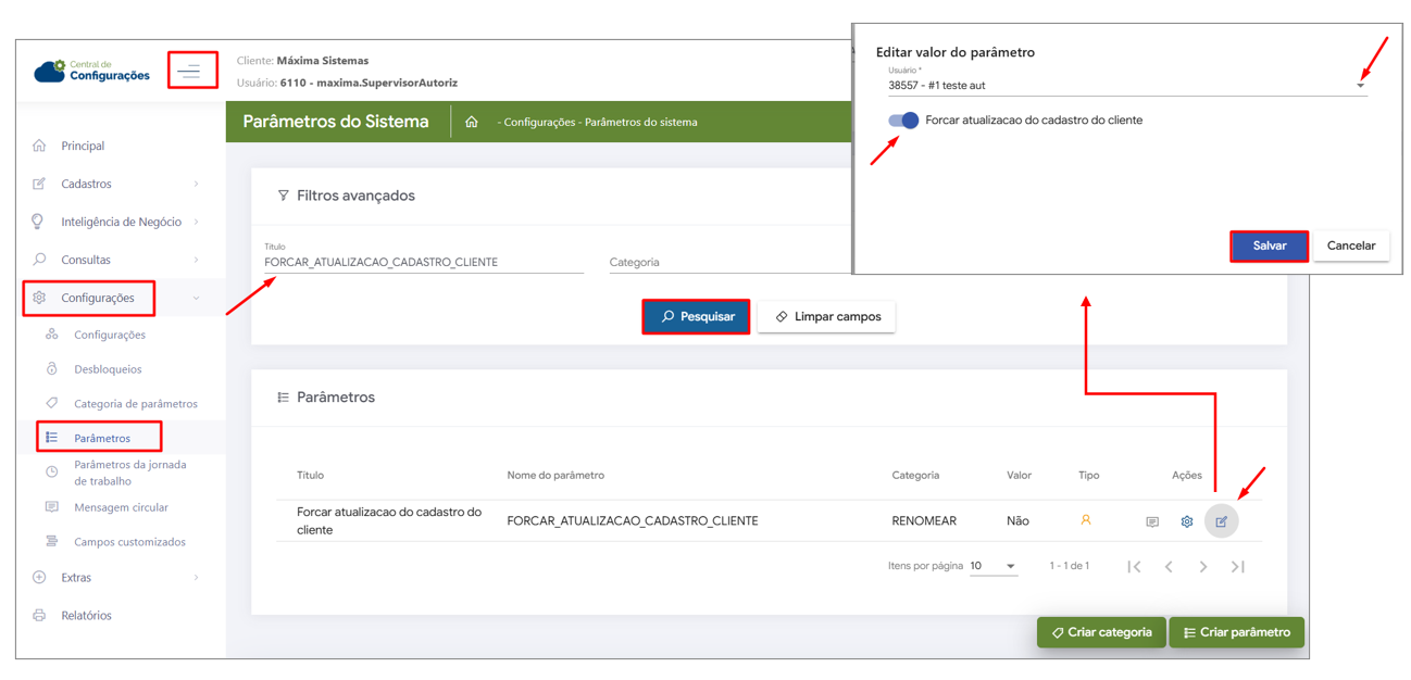 2- Busque pelo parâmetro FORCAR_ATUALIZACAO_CADASTRO_CLIENTE, clique em pesquisar