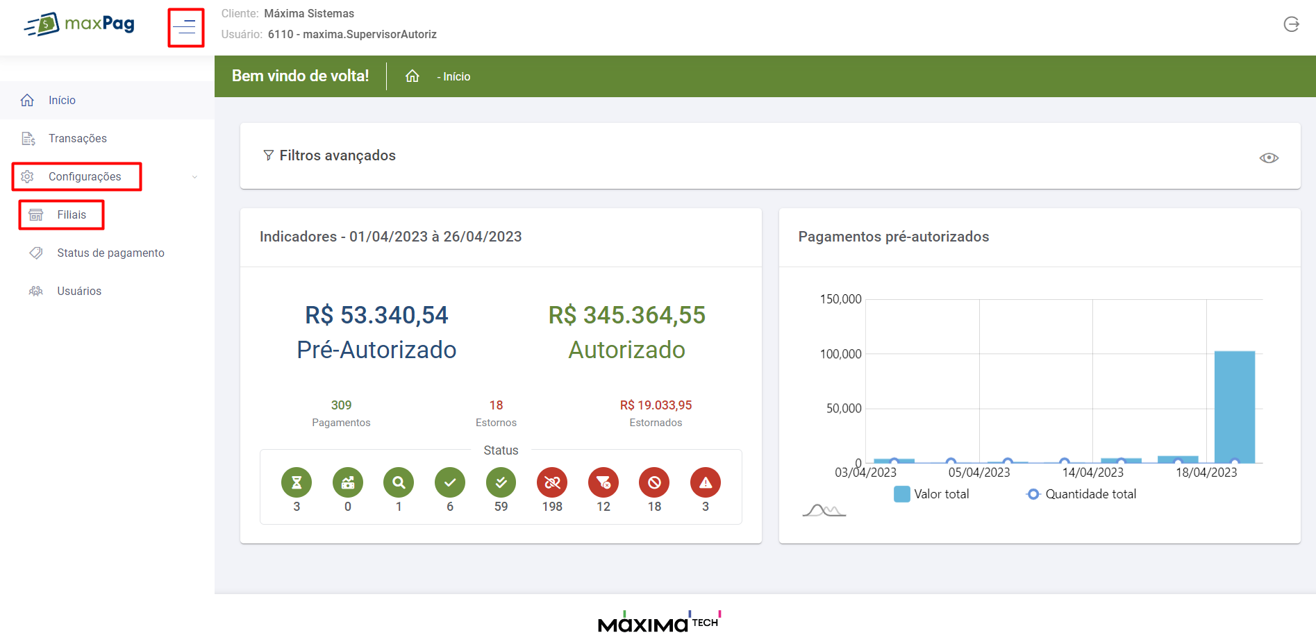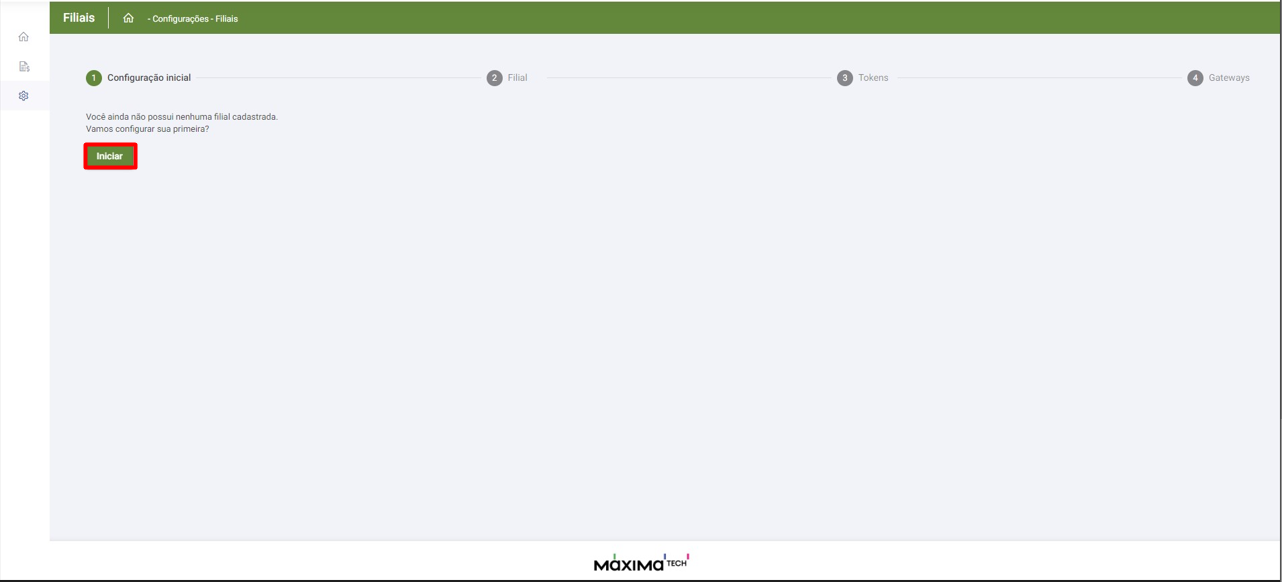 1- Na página de entrada do maxPag, no meu lateral, clique em Configuração> Filiais .