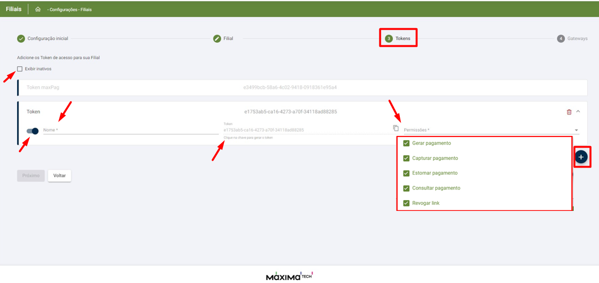 4-Na parte do Token é necessário habilitar Token marcando opção, inserir nome que pode ser o da filial, ou não, pois depende se irá cadastrar somente um Token por Filial, na opção Token o mesmo é gerado e selecione as permissões indicando o que os usuários terão acesso no maxPag. EX: Gerar pagamento, estornar pagamento entre outros. Para gerar mais de um token basta clicar no ícone de +.
