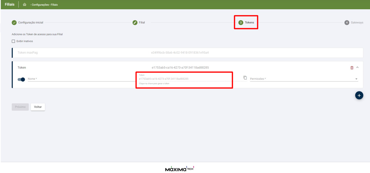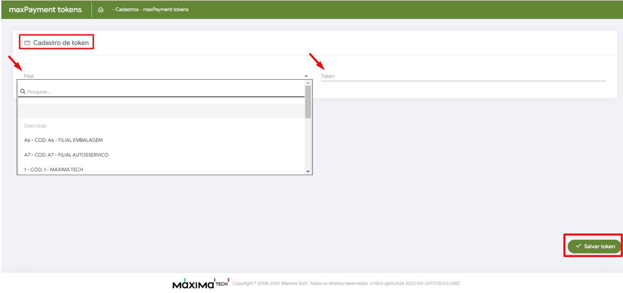 5- Selecione a filial e insira o token copiado do maxPag e clique em salvar.