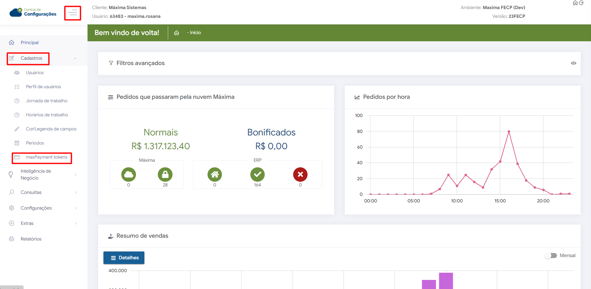 3-Na tela inicial da central de configurações no menu lateral , acesse Cadastro>> maxPayment Tokens.