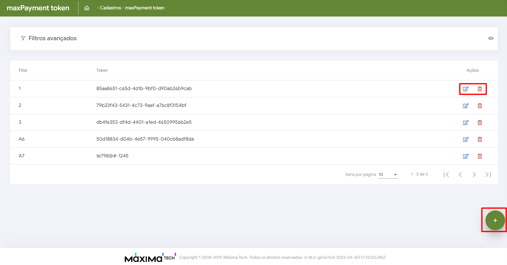 4- Nessa tela é possível Editar token cadastrado ou excluir clicando no ícone. Para inserir novo Token clique no ícone de +, no canto inferir direito da tela.