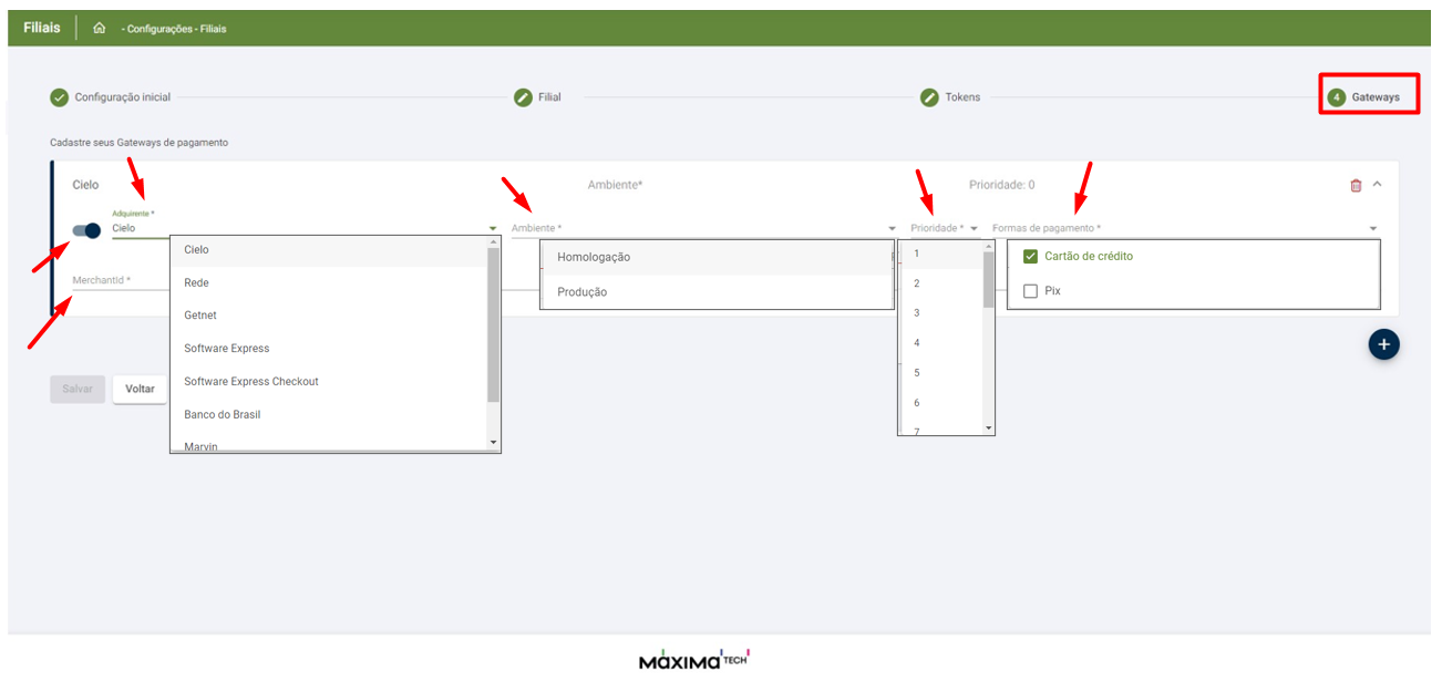 5- Na tela de Gateways é necessário habilitar marcando opção, informe os adquirentes, o ambiente utilizado, a prioridade que varia de 1 a 20 e a Forma de pagamento.
