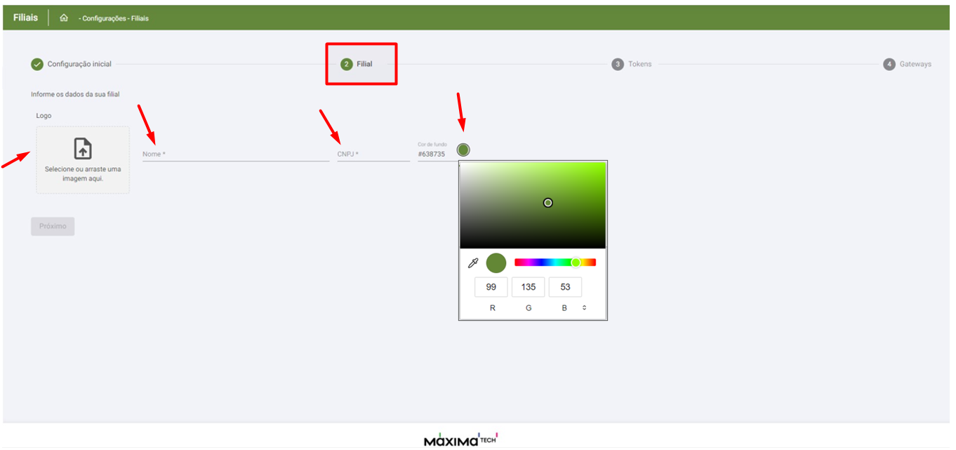 3-Após iniciar a tela irá mudar para cadastro de Filial, nessa tela é possível selecionar logo buscando imagem salva no computador ou arrastando a imagem, preencha o nome da Filial, Cnpj e a cor de fundo que indicará a identidade visual da empresa, que será apresentado quando o cliente entrar no link de pagamento.