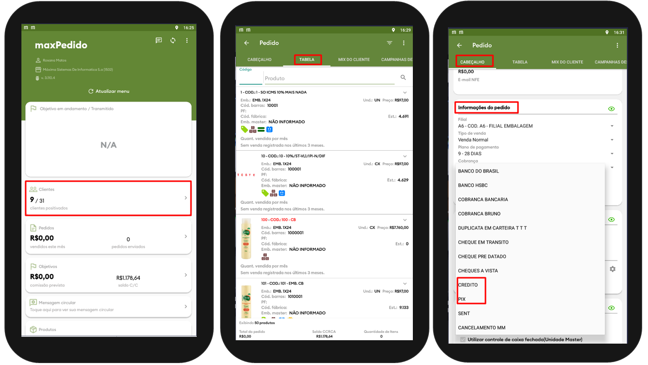 1- Ao acessar o aplicativo do maxPedido clique no menu clientes, selecione o cliente desejado e inicie o Pedido, na aba tabela selecione os itens que irão compor o Pedido, e na aba cabeçalho em informações do pedido, após selecionar a filial, plano de pagamento, selecione a cobrança cartão de crédito ou Pix.