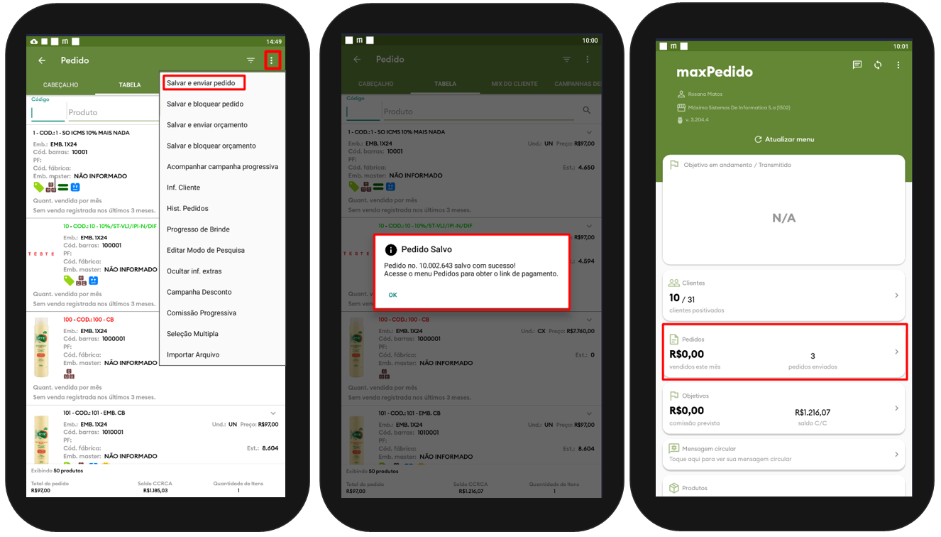 , selecione a opção de salvar e enviar pedido. Ele retornará uma mensagem informando que foi enviado com sucesso e solicitando que acesse o menu Pedidos para obter o link de pagamento.