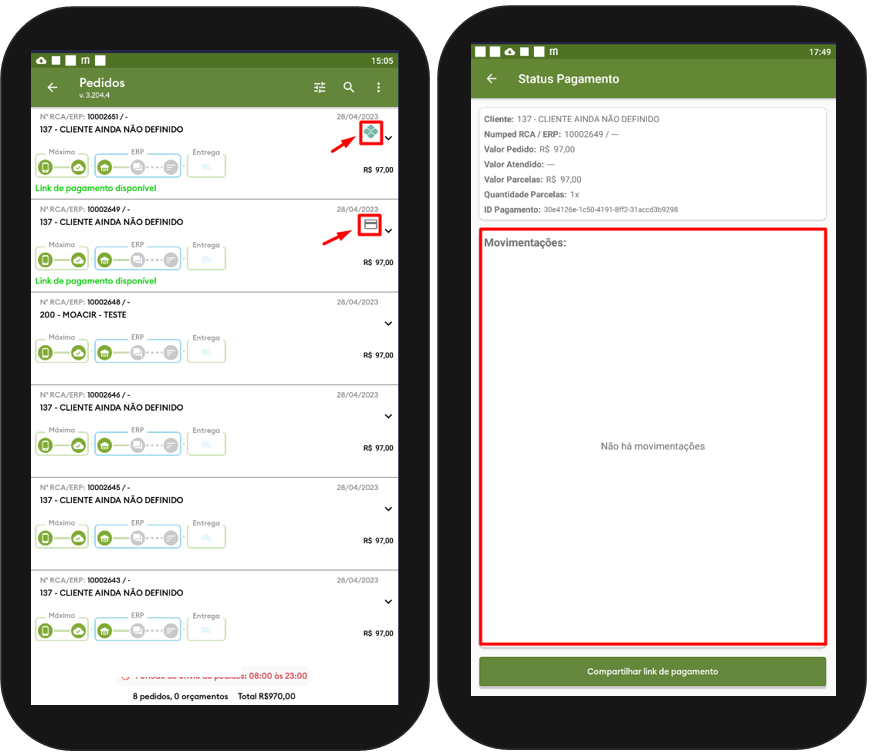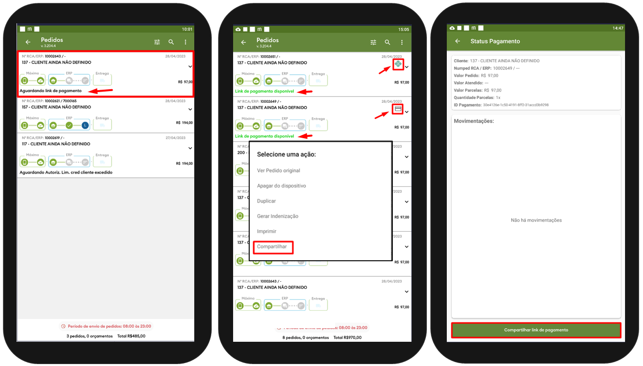 3- Ao acessar o menu Pedidos, constará no pedido realizado que está Aguardando link de pagamento, atualizando a página o link de pagamento ficará disponível. Há duas formas de compartilhar o mesmo, dando um clique longo em cima do pedido desejado, onde surgirá opção de compartilhar ou clicando no ícone de cartão