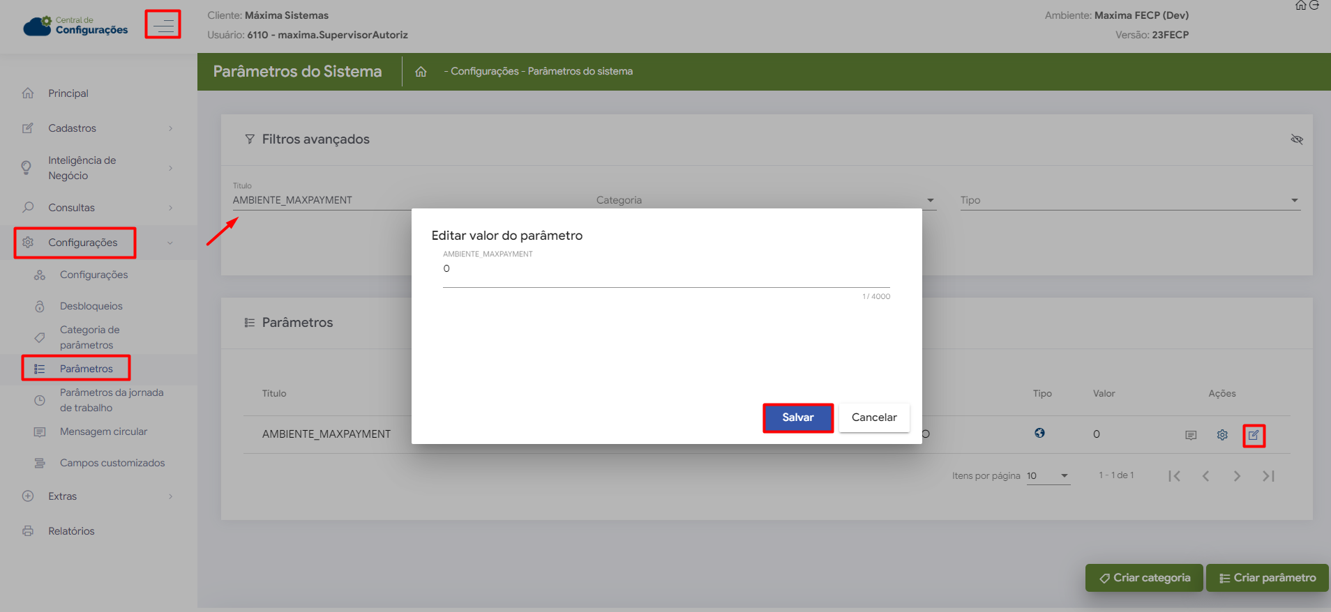 - AMBIENTE_MAXPAYMENT - Valida se os dados do cartão de crédito que serão usados para pré-autorização serão de cartões de produção ou homologação. Parâmetro NUMBER 0 ou 1 se o 0=HMO, se 1=PROD.