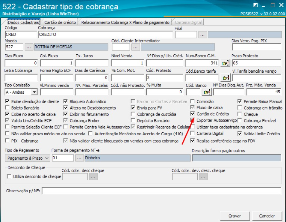 2- Para cartão de credito, a flag "Cartão de crédito" precisa estar habilitada