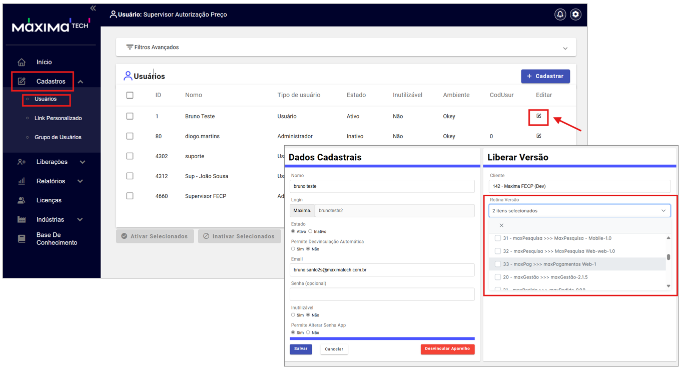 1- Opção Menu cadastro>usuários> clique no ícone de editar> selecione a versão dentre as que estão liberadas para o usuário.