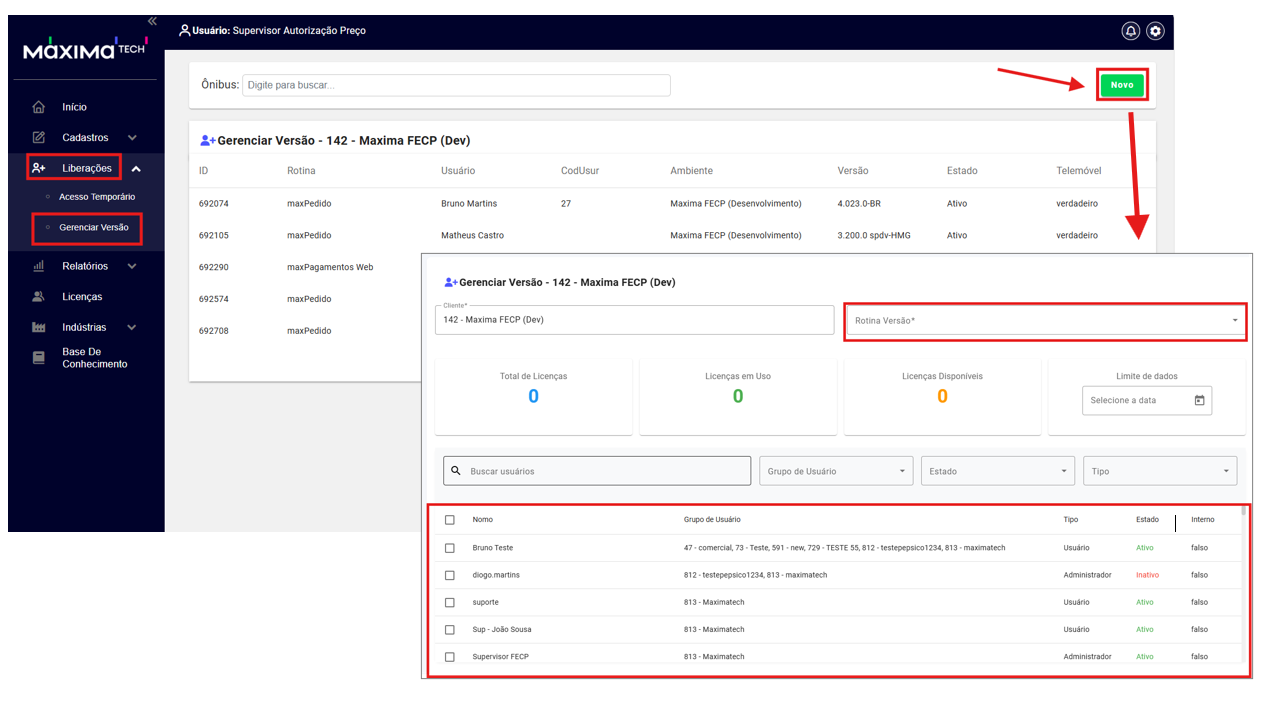 2- Opção caso deseje liberar para mais de um usuário, Menu Liberações> Gerenciar Versão> clicar botão Novo> Selecionar usuários e preencher informações e selecionar versão a ser liberada.