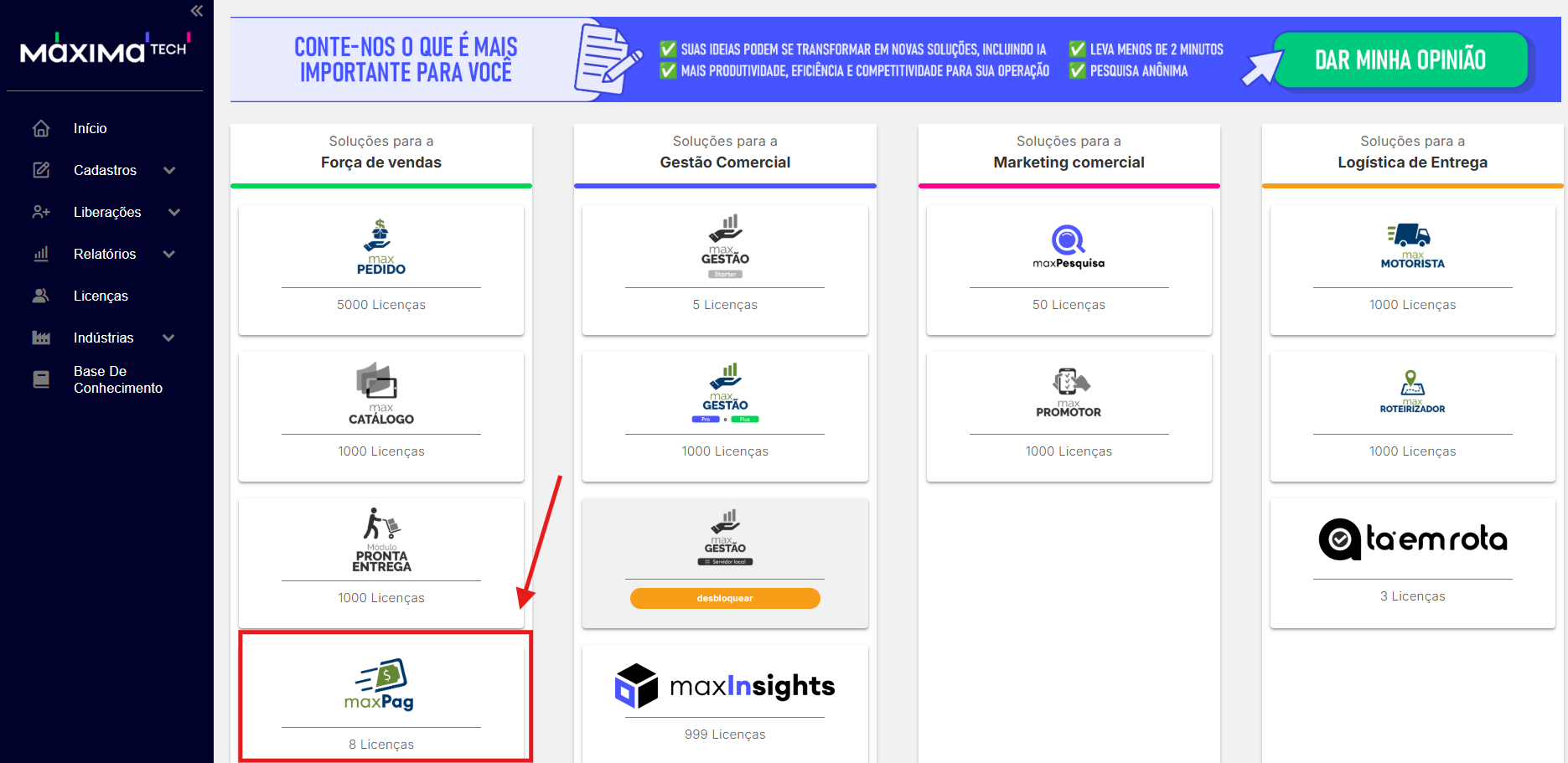 1-Após liberar a versão para os usuários é hora de acessar o maxPag para realizar as configurações. No menu inicial do maxSoluções clique na tela do maxPag.