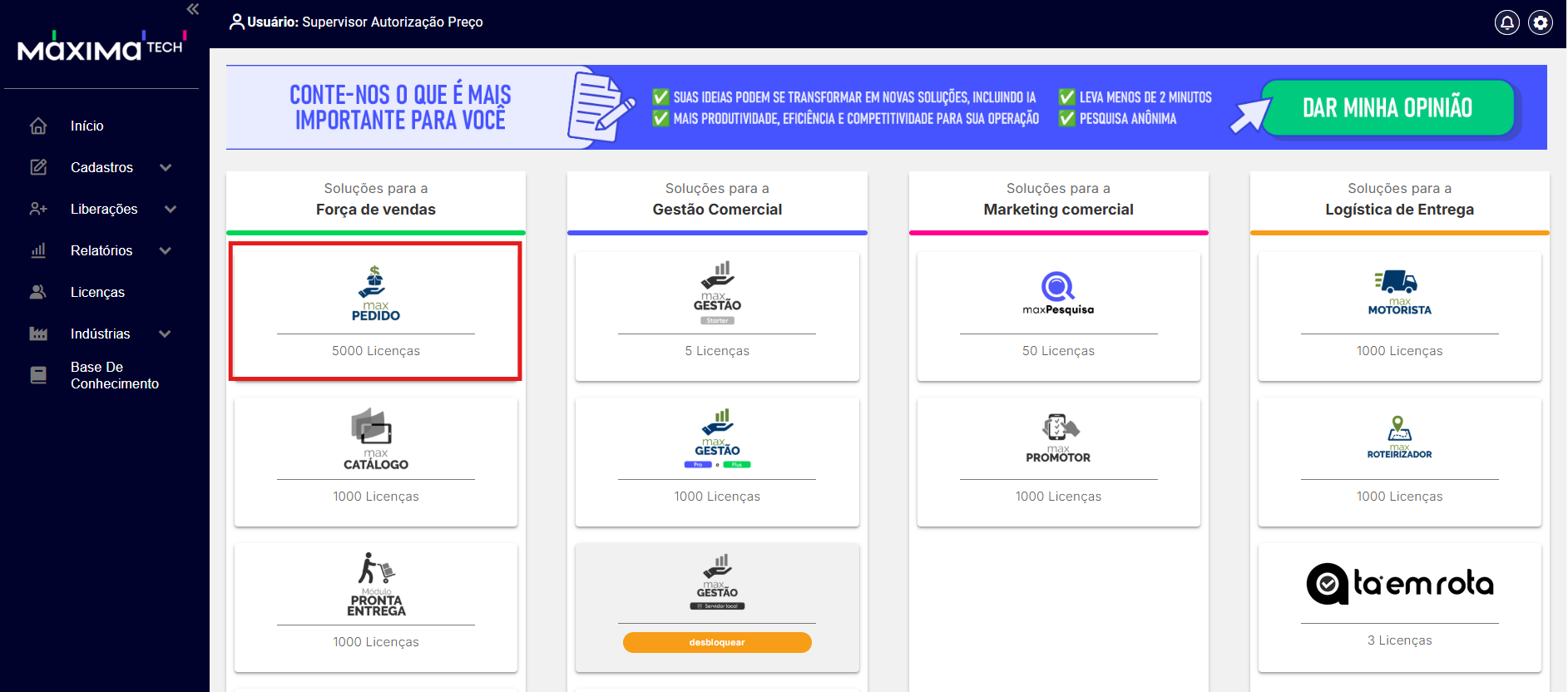 Na tela inicial do maxSoluções acesse maxVenda >> maxPedido.