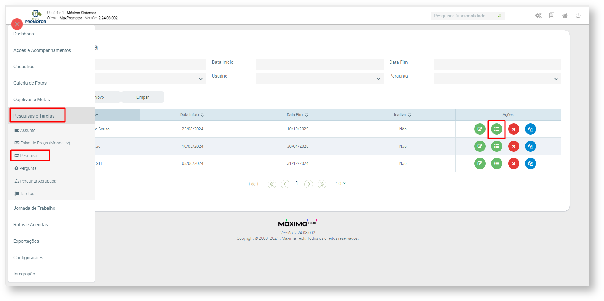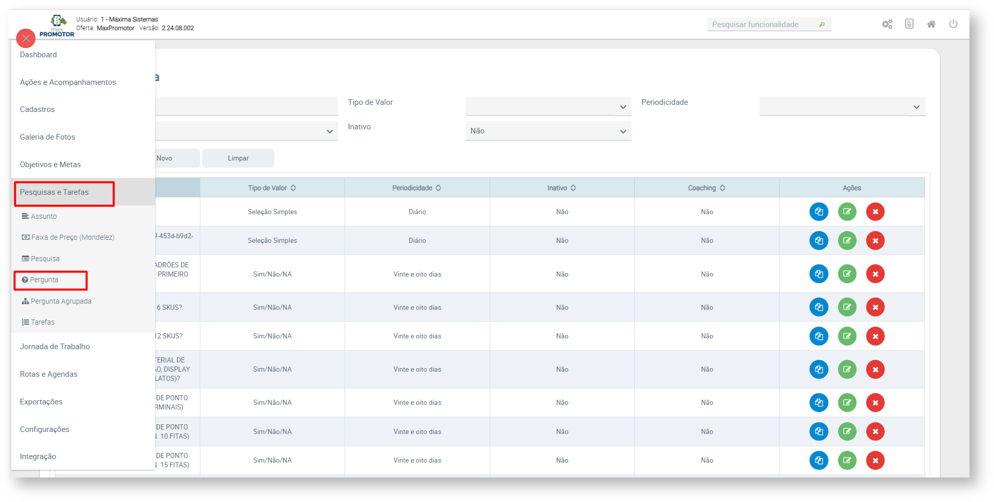 1- Após cadastrar Perguntas clicando em Pesquisas e Tarefas> Perguntas