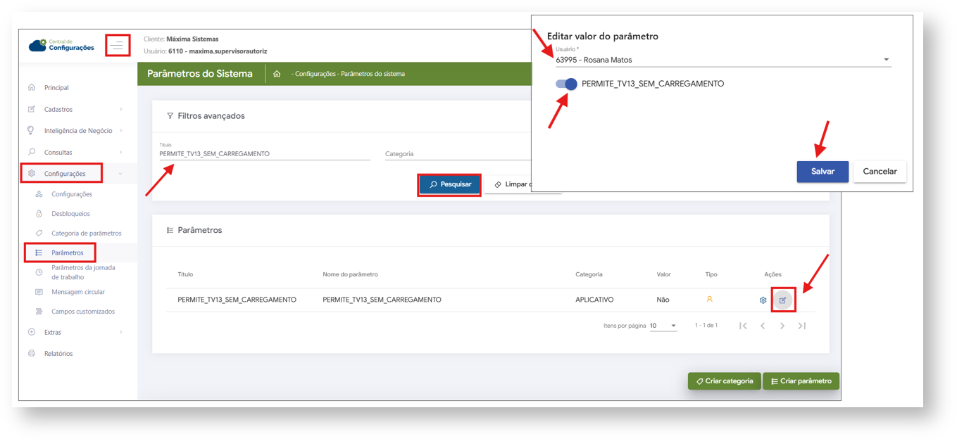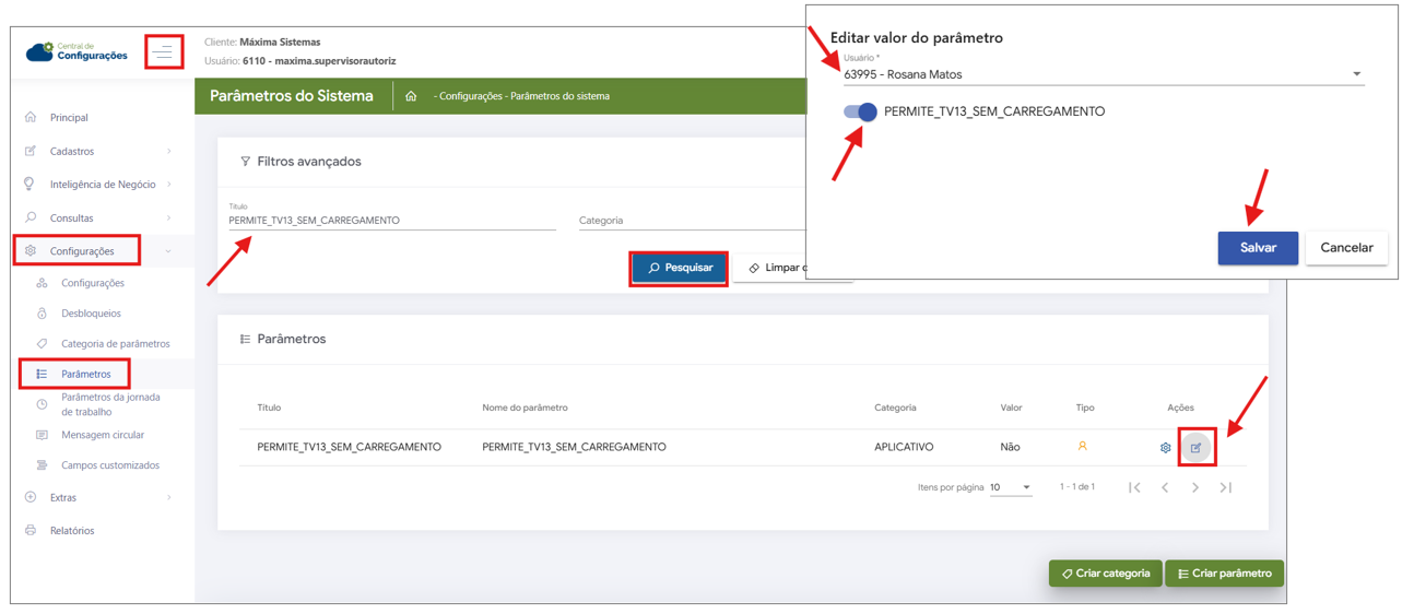 3- Busque pelo parâmetro PERMITE_TV13_SEM_CARREGAMENTO em filtro e clique em pesquisar