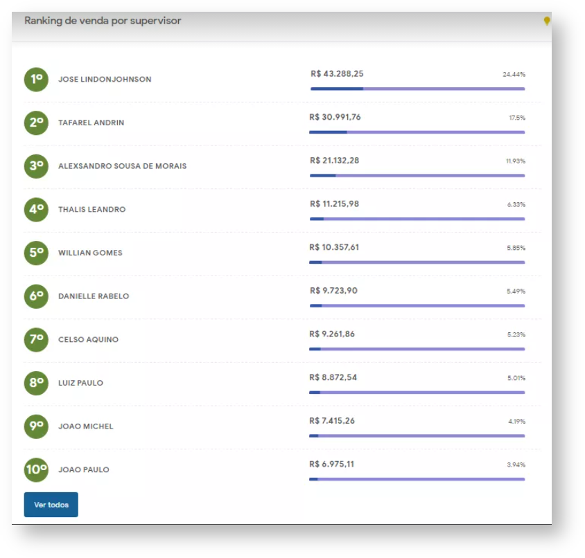 O Ranking de venda por supervisor visa mostrar os resultados por equipe, ou seja, qual equipe está entre as que mais vendem. O resultado é mostrado de acordo com informações preenchidas em filtro e somente para o usuário com permissão de acesso a visualizar essas informações. O intuito do Ranking de venda por supervisor, além de dar destaque aqueles que estão a frente reconhecendo o trabalho realizado, é também de influenciar as demais equipes a buscarem melhores resultados. O percentual exibido é relativo ao total de venda que a equipe do supervisor realizou em relação a soma de todos os supervisores.