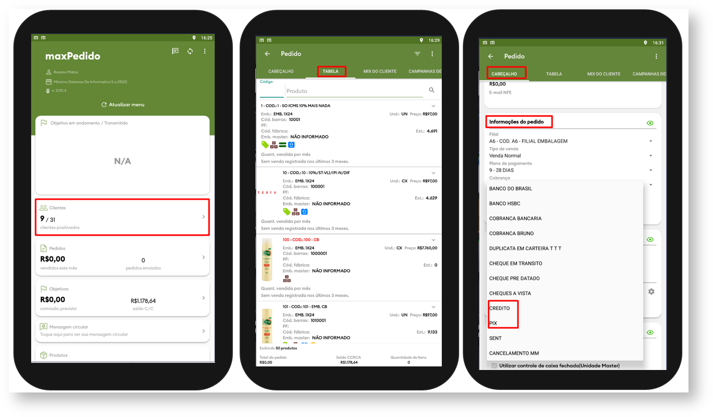 Ao acessar o aplicativo do maxPedido clique no menu clientes, selecione o cliente desejado e inicie o Pedido, na aba tabela selecione os itens que irão compor o Pedido, e na aba cabeçalho em informações do pedido, após selecionar a filial, plano de pagamento, selecione a cobrança cartão de crédito ou Pix.
