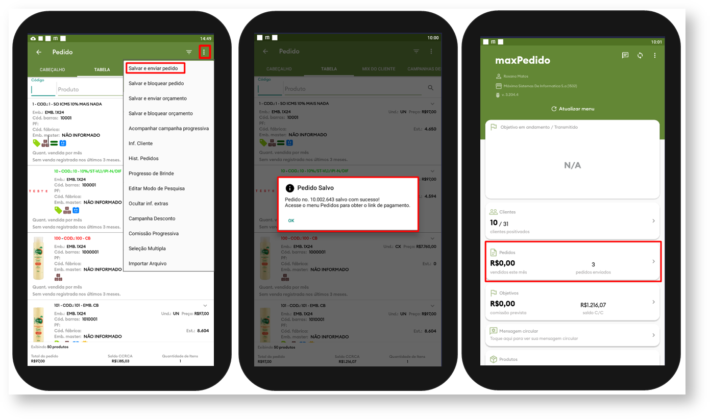 Após selecionar as informações necessárias bem como os itens do Pedido no menu lateral superior direito , selecione a opção de salvar e enviar pedido. Ele retornará uma mensagem informando que foi enviado com sucesso e solicitando que acesse o menu Pedidos para obter o link de pagamento.