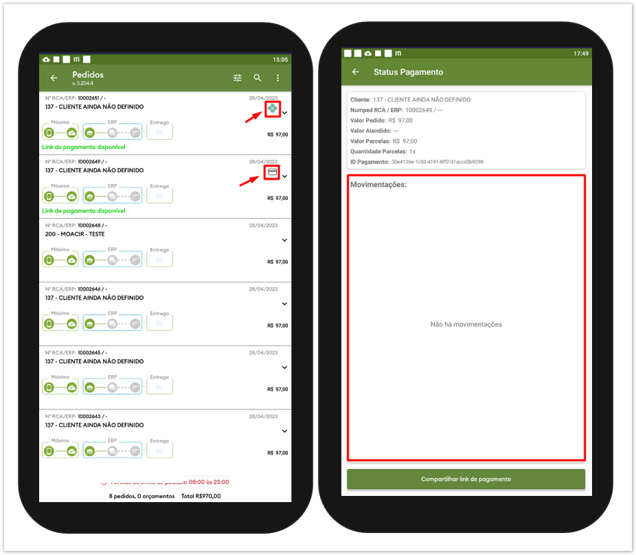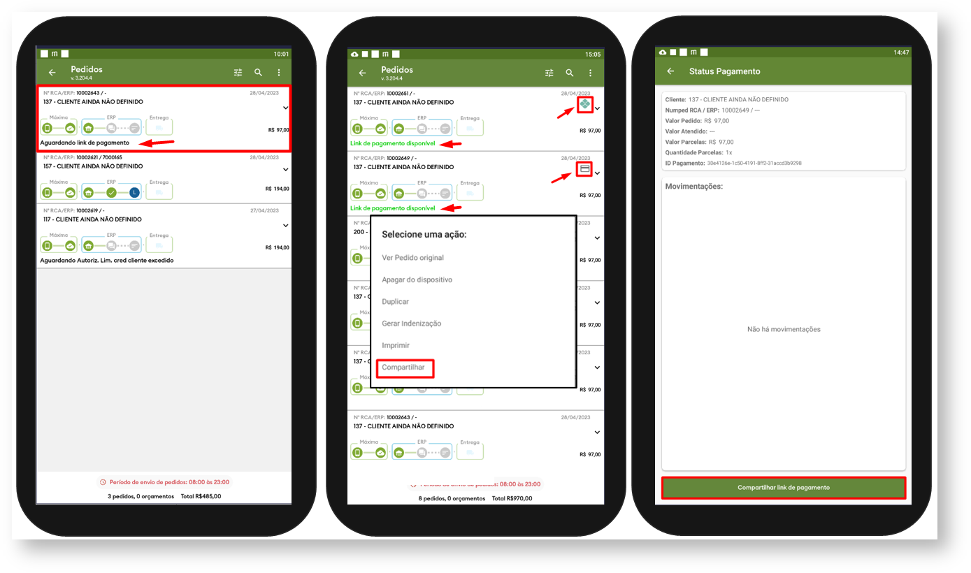 Ao acessar o menu Pedidos, constará no pedido realizado que está Aguardando link de pagamento, atualizando a página o link de pagamento ficará disponível. Há duas formas de compartilhar o mesmo, dando um clique longo em cima do pedido desejado, onde surgirá opção de compartilhar ou clicando no ícone de cartão  ou pix , nesse caso abrirá uma nova tela de status do pagamento com a opção de compartilhar o link.