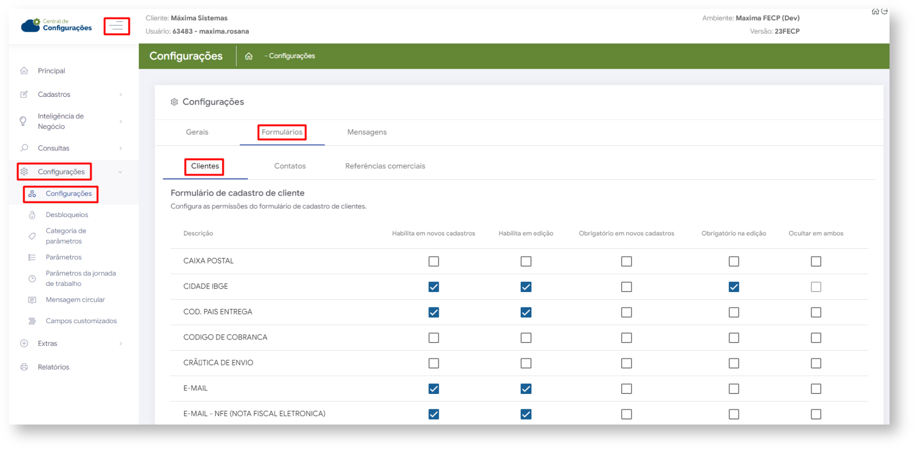 2- Na Aba Formulários> Clientes  serão apresentados as informações onde poderão ser marcadas se Habilita em novos cadastros, Habilita em edição, Obrigatório em novos cadastros, obrigatório em edição ou ocultar em ambos, ou seja, dessa forma irá configurar os dados que o vendedor precisará ou não preencher na criação ou edição de cadastro de clientes. Saiba mais