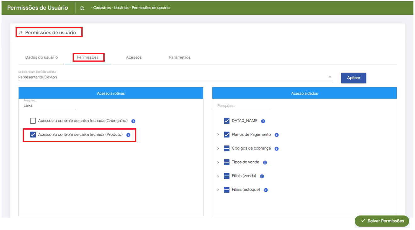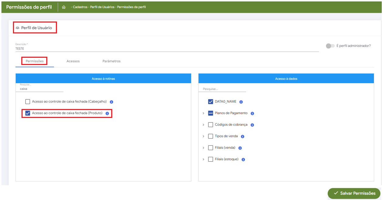1.2 Temos duas formas de permissão no aplicativo, na aba permissões no quadro de Acesso a Rotinas busque pela permissão Acesso ao controle de caixa fechada (Produto), essa permissão quando marcada indica que a opção de Embalagem Master vai ser disponibilizada na tela de negociação do item, ao marcar a permissão Acesso ao controle de caixa fechada (Cabeçalho) a opção Embalagem Master será disponibilizada no cabeçalho do Pedido para marcação.