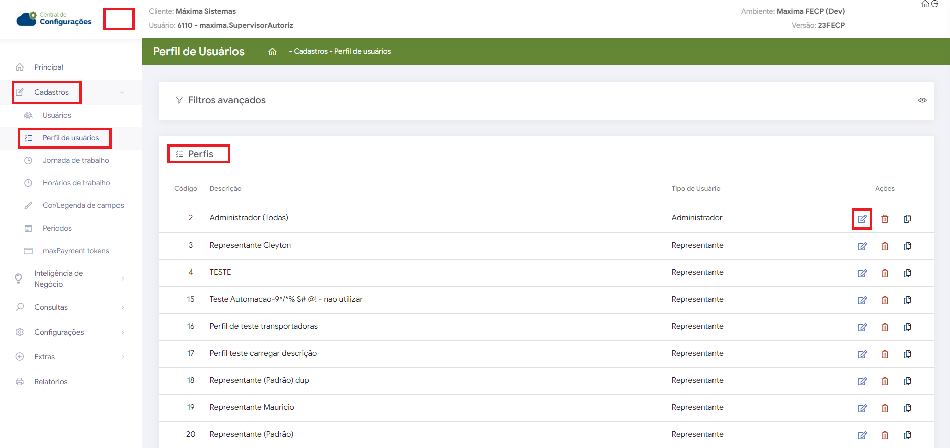 , clique em Cadastro>> Perfil de usuários, selecione o Perfil ao qual deseja dar permissão e clique no ícone de edição do perfil