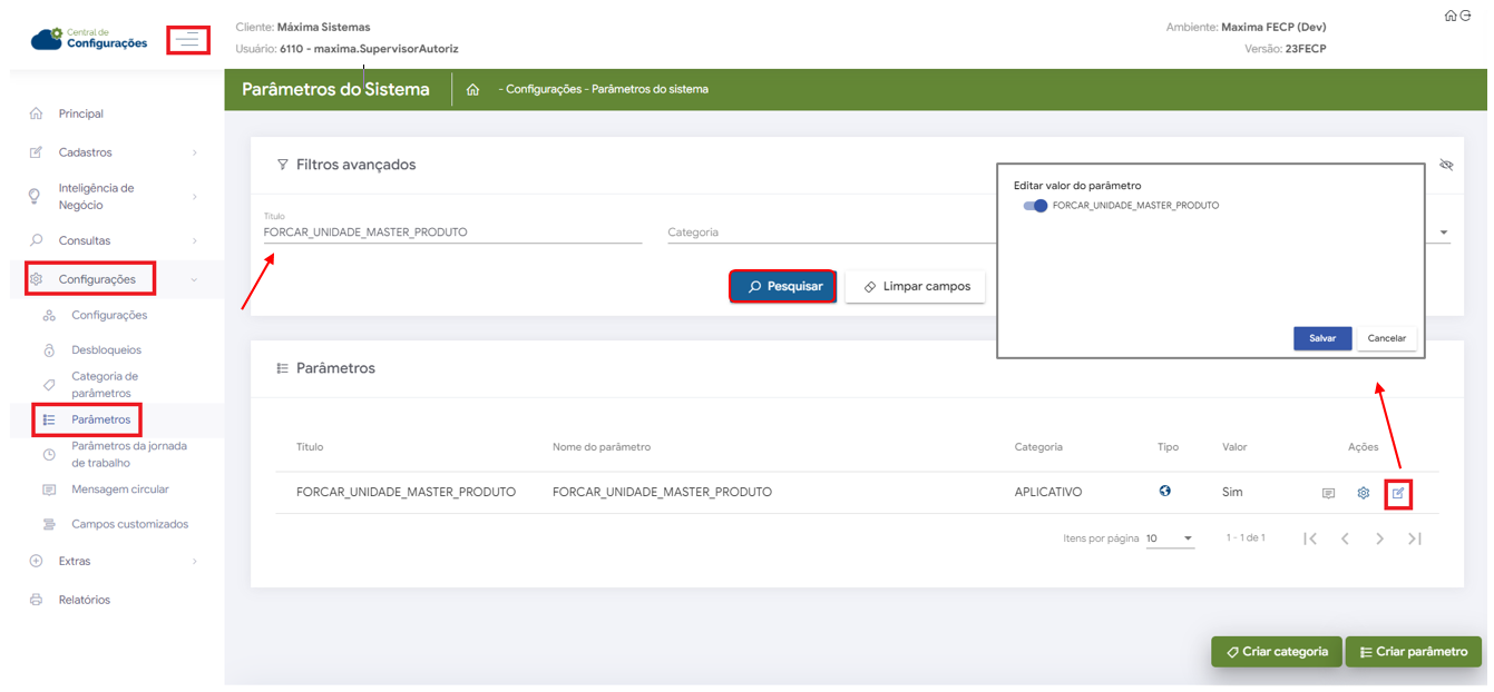 , clique em Configurações>> Parâmetros, busque pelo parâmetro desejado e clique no ícone