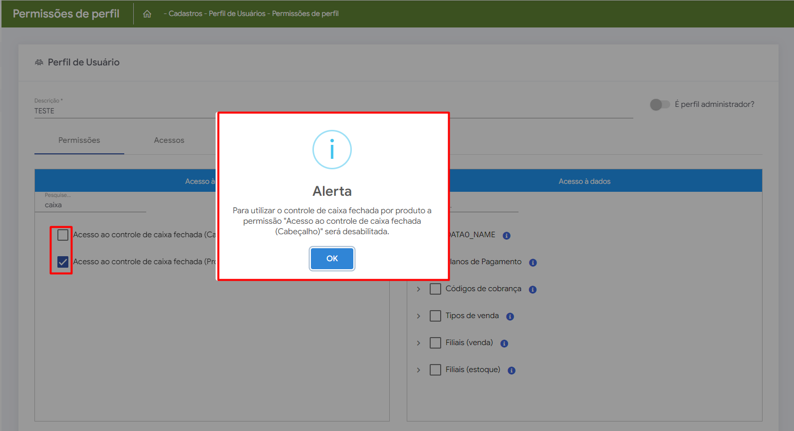 1.3 Ao marcar uma das permissões surgirá uma mensagem informando que a outra permissão relacionada a Embalagem Master será desmarcada indicando que não é possível visualizar no Cabeçalho do Pedido e na tela de Negociação do produto ao mesmo tempo.