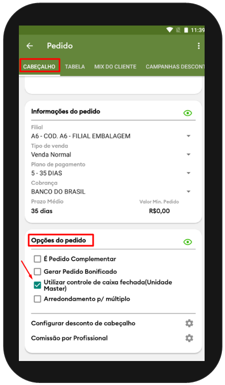 3.1 Ao iniciar um pedido se a permissão Acesso ao controle de caixa fechada (Cabeçalho) estiver marcada ela poderá ser visualizada na aba cabeçalho em opções do Pedido, conforme item 1.2 e imagem abaixo.