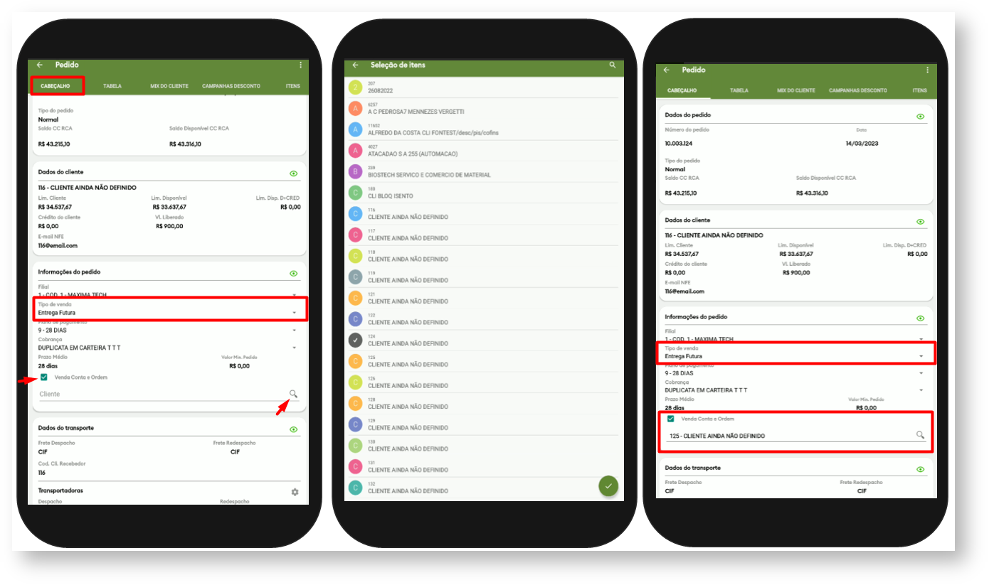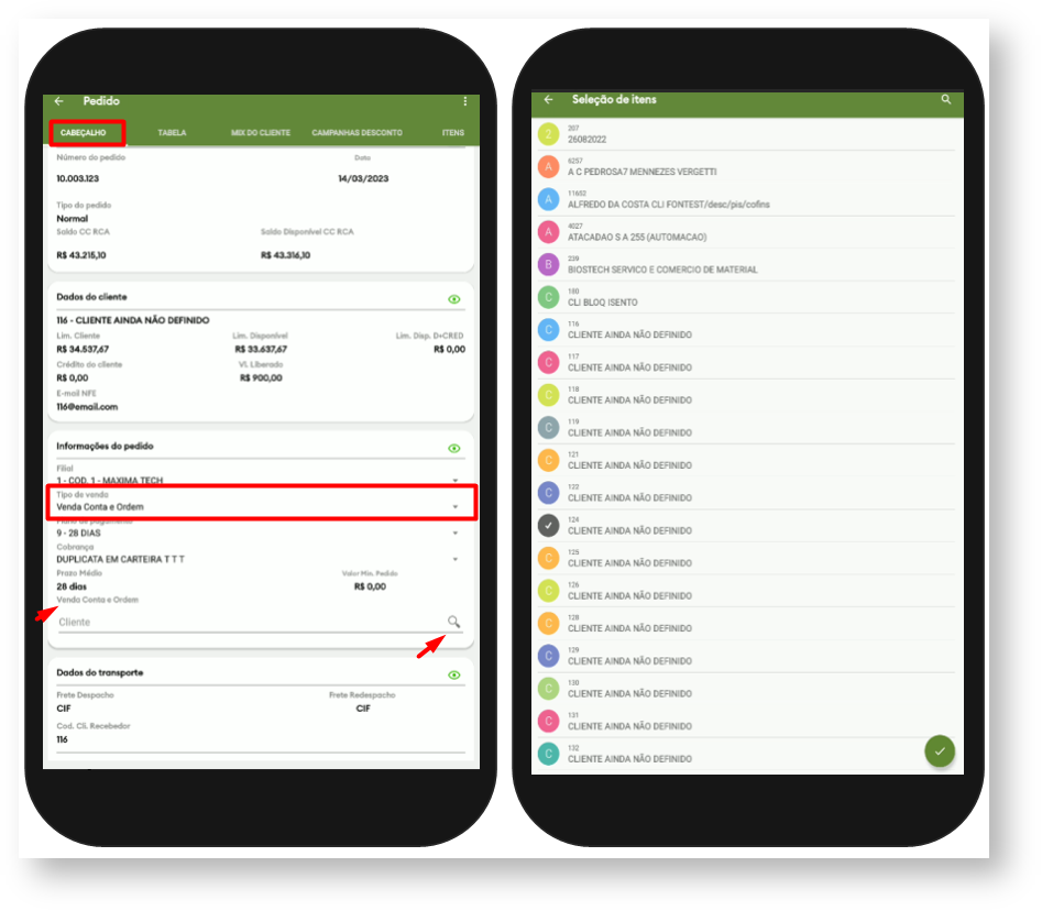 Nesse fluxo ao iniciar o pedido na aba cabeçalho e escolher o tipo de Venda Conta e Ordem, surgirá o campo para buscar e selecionar o Cliente, caso alterado para outro tipo de venda o campo de Cliente será ocultado. Nesse fluxo não há necessidade de marcar conta e ordem, pois ela estará habilitada automaticamente.