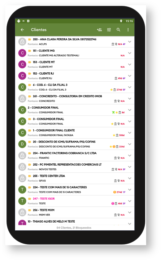 2.1 No aplicativo há duas formas de visualizar,  através do card. de Clientes ou card. de Produtos, é possível acessar arrastando ou clicando  neles.