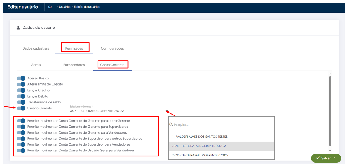 3- No cadastro do usuário, acesse Permissões> aba Conta corrente.