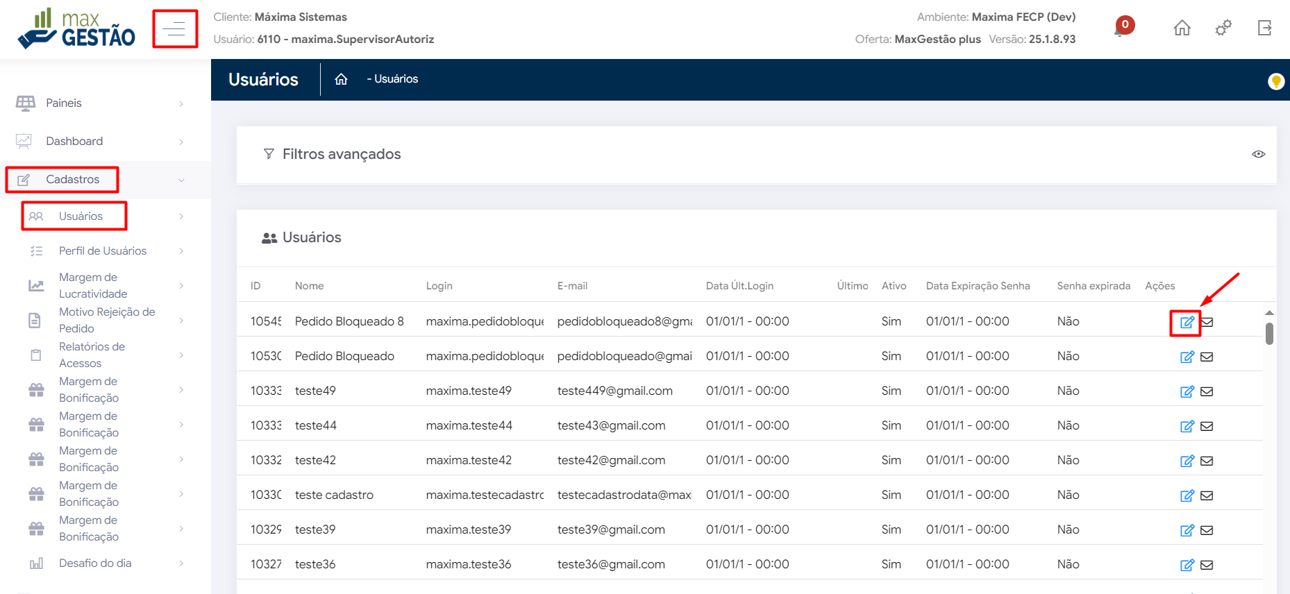 2- Selecione o usuário que deseja e clique sobre o ícone de edição na coluna Ações.