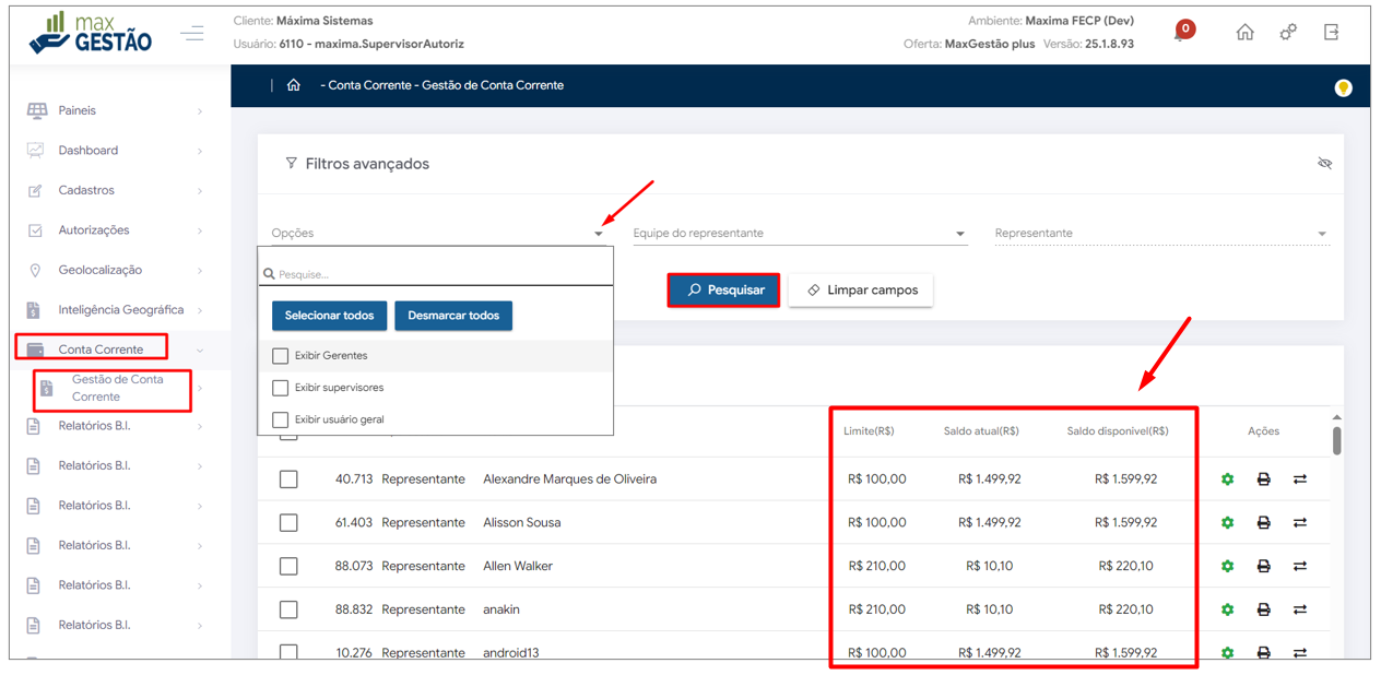 8- Estarão apresentados nas colunas Limite, Saldo Atual e Saldo Disponível.
