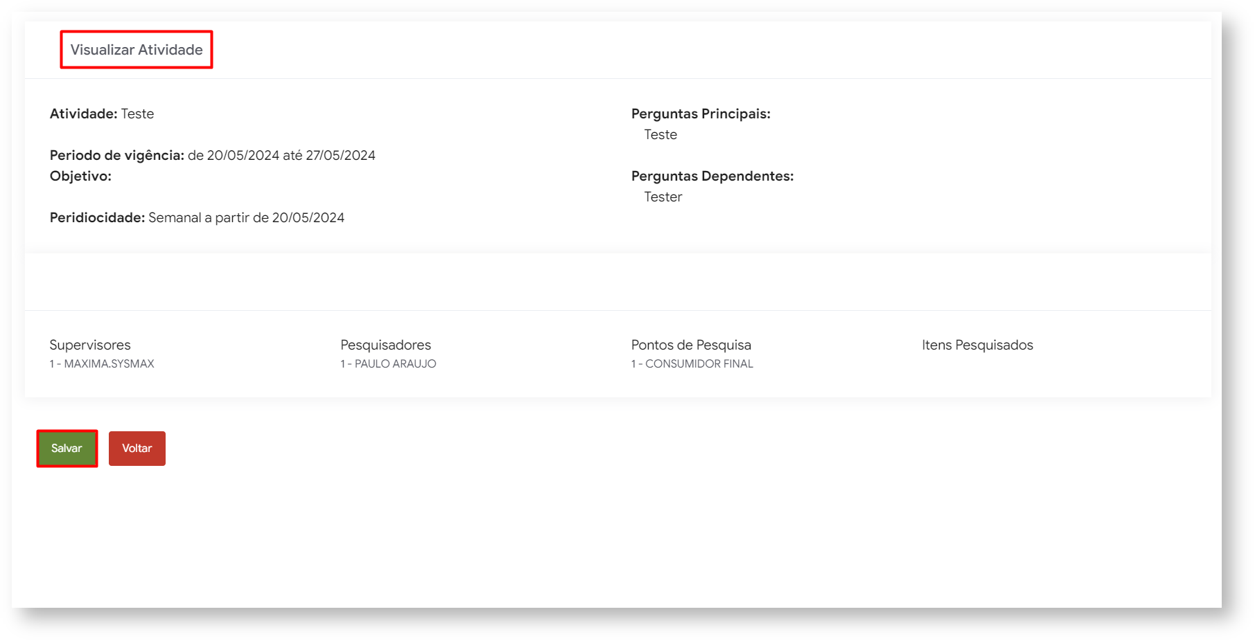 3.7 Ao clicar em salvar poderá ser visualizada na tela os dados da atividade conforme preenchidos, caso os dados estiverem corretos basta clicar em salvar.