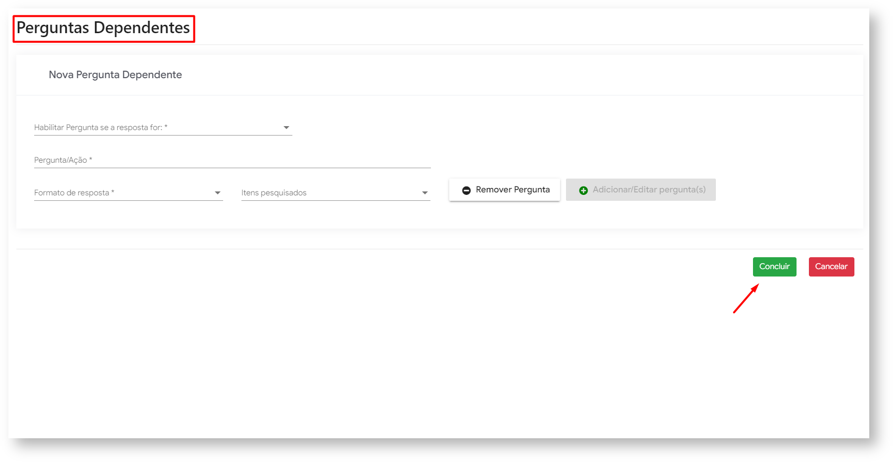 3.5 Preencha as informações solicitadas para cadastro de pergunta dependente, após preencher clique em concluir.
