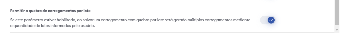 Na tela de parâmetros do portal ativar o parâmetro: Permitir a quebra de carregamentos por lote,