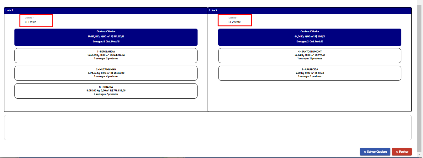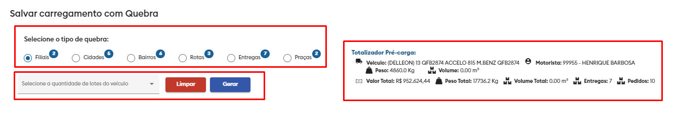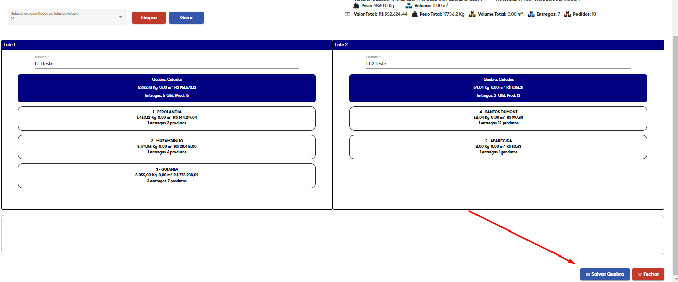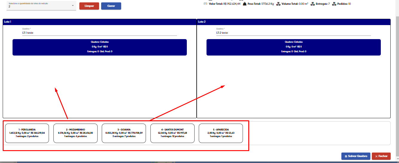 - Quantidade de lotes: Permite informar a quantidade de lotes presente no veículo para realizar a quebra dos lotes.