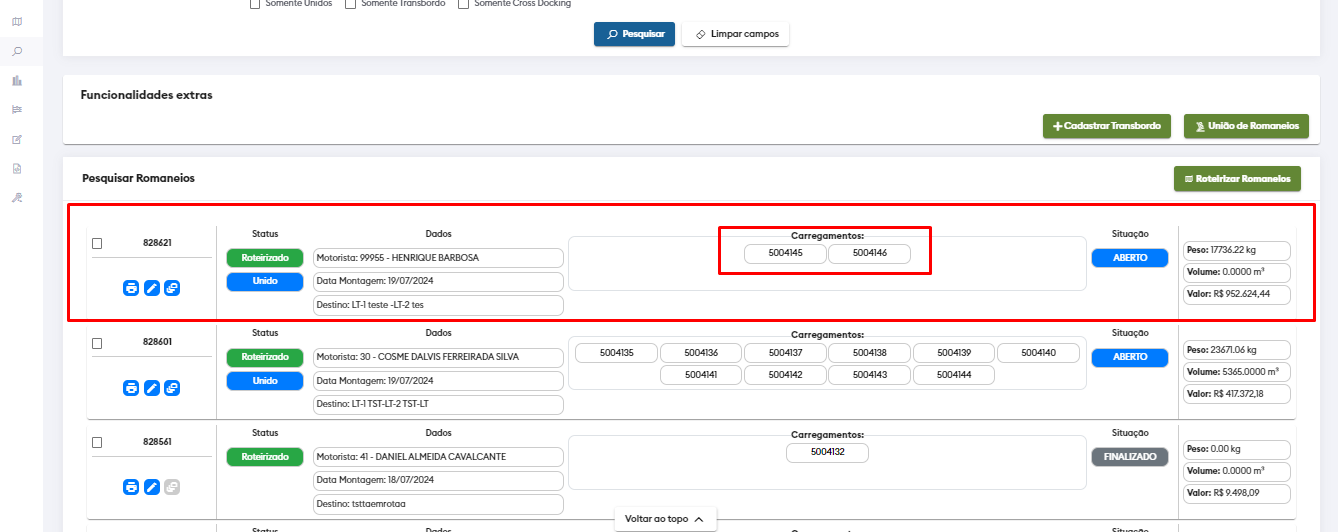 | Vale ressaltar que caso o usuario queira, pode ser alterado o destino de ambos carregamentos que estão sendo gerados,