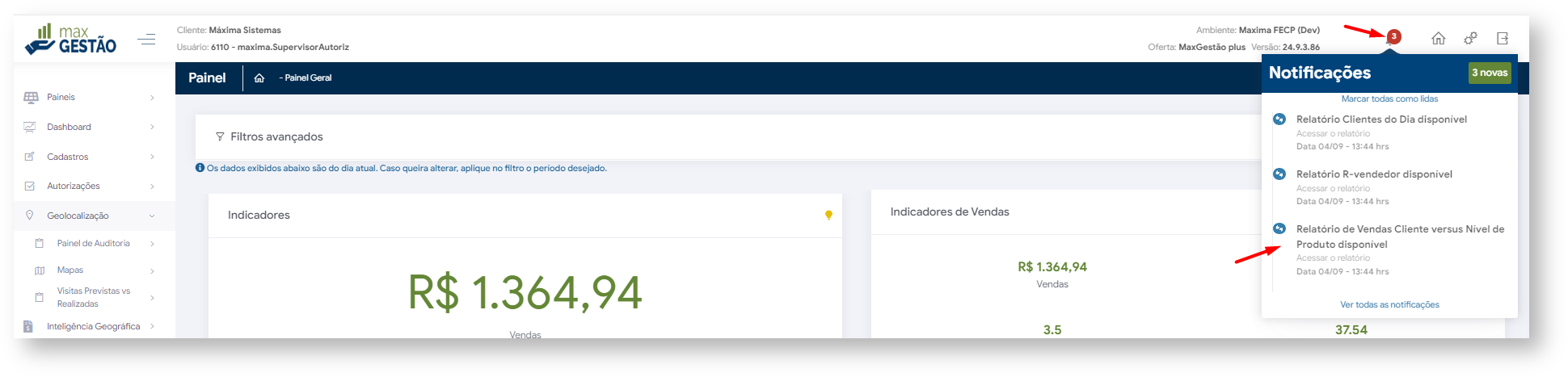 O relatório de Acompanhamento de cliente vs nível de produto será enviado uma vez ao dia sendo sinalizado pelo ícone de notificação do maxGestão.