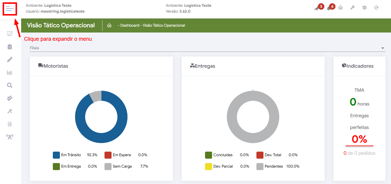 ┌ Tela inicial da solução MaxMotorista Web, expanda o menu lateral esquerdo: