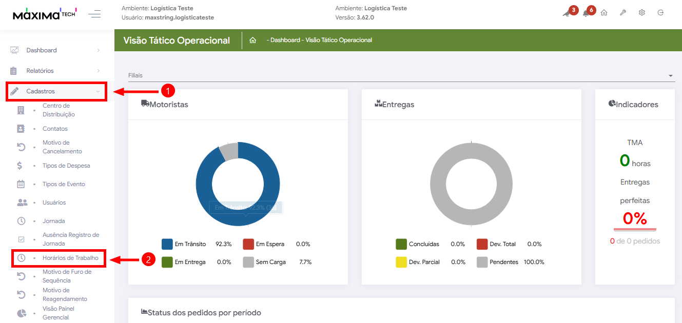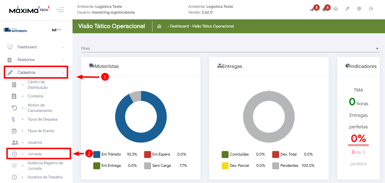┌ No menu lateral, clique em Cadastros e selecione Jornada: