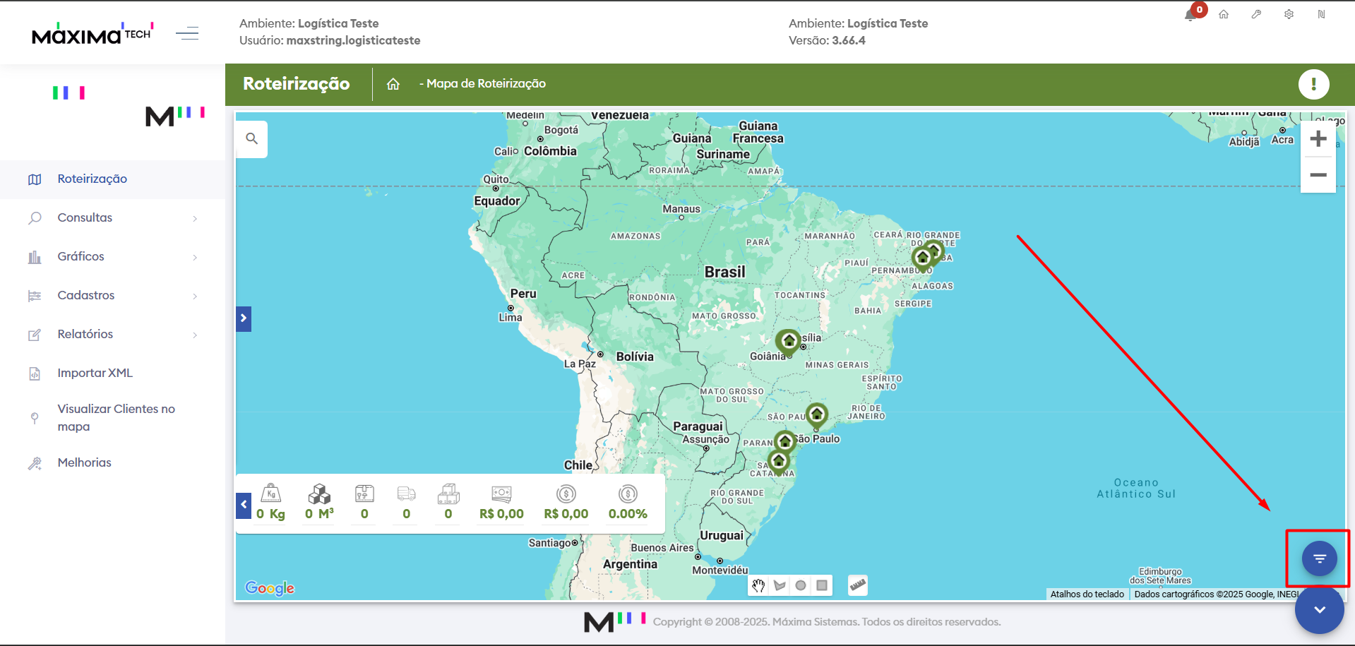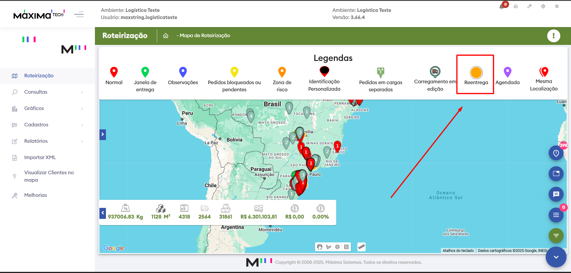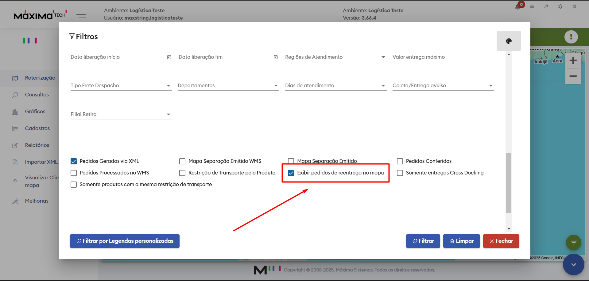 - Após preencher todos parâmetros necessários, no final da tela, marque a opção "Exibir pedidos de reentrega no mapa" e clique em Filtrar.
