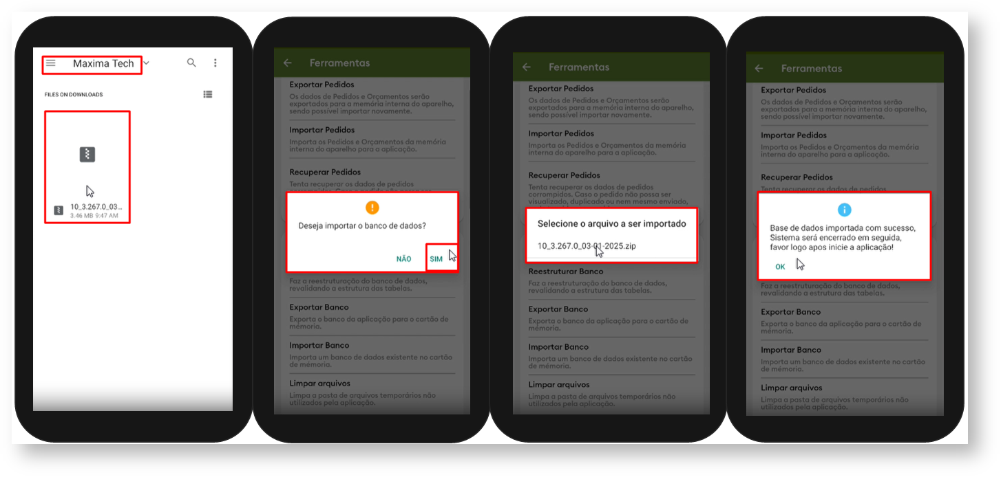 | A partir da versão 3.267.0, o fluxo de exportação e importação de bases foi atualizado para atender diretrizes de segurança do Android. |