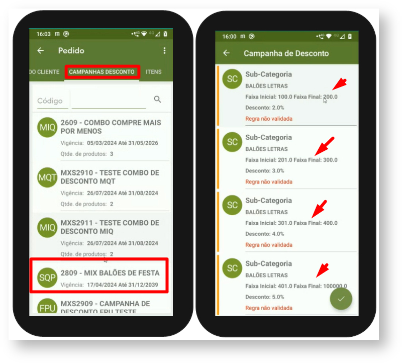 2.1 Após iniciar o pedido clique na aba Campanhas de Desconto, ao clicar na campanha SQP, pode ser visto várias regras cadastradas com faixas inicial e final diferentes, no caso elas foram cadastradas visando desconto diferentes para para cada faixa.