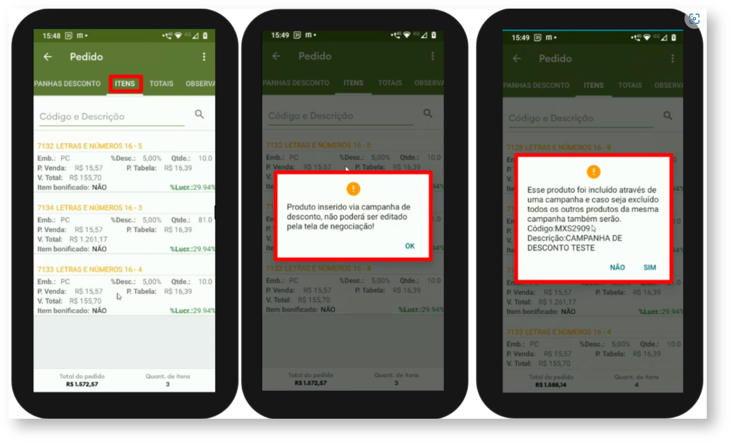 2.2 Após inserido, na Aba Itens é possível ver a listagem de produtos inseridos, produtos estes que serão apresentados de cor diferente demonstrando que eles fazem parte de uma campanha. Através da aba itens não é possível realizar edição do item, caso precise alterar a quantidade deverá voltar a aba de campanha de Desconto, também não é possível realizar exclusão de item através, caso tente excluir será informado que os demais produtos do combo também serão excluídos.