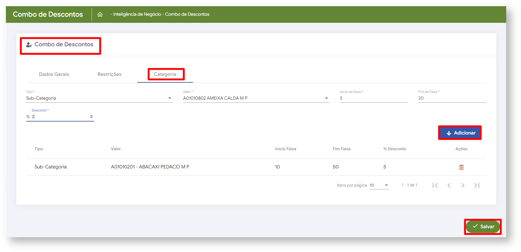 Após preencher os dados clique em adicionar, lembrando que é possível cadastrar quantas Faixas desejar cada uma com um tipo, valor, inicio e fim de faixa e desconto especifico.
