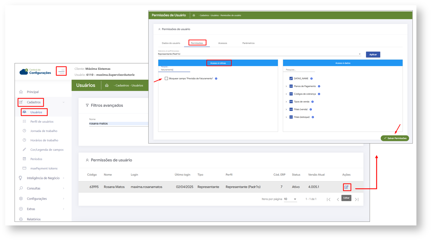 2- Selecione o usuário desejado e clique no ícone de edição na coluna Ações