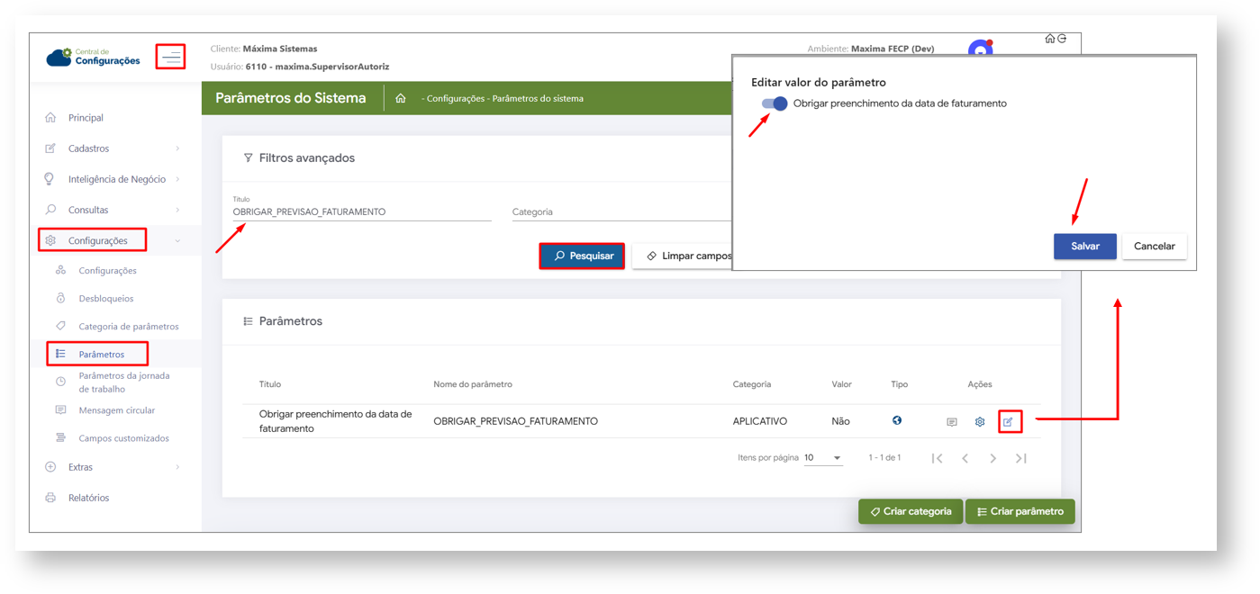 2- Busque pelo parâmetro OBRIGAR_PREVISAO_FATURAMENTO, clique em pesquisar
